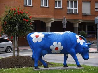 Keywords: vizcaya spain cow statue painted flowers blue grass building interesting art artistic tree nature outside