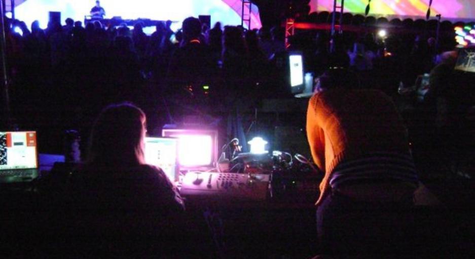 Keywords: VJs at motion notion festival 2009.jpg en Two VJs collaborating at an outdoor electronic music festival own Carriegates 2009-07-18 VJ video performance art