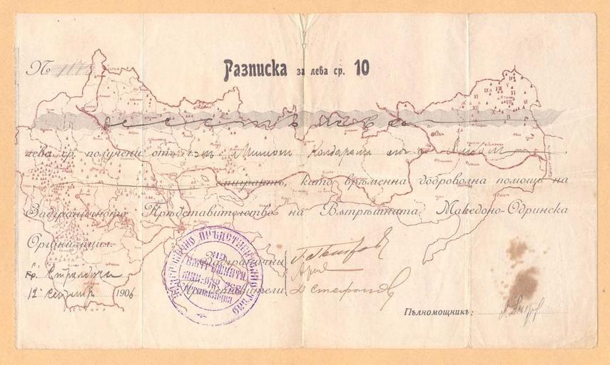 Keywords: Vmro kartichka.JPG Разписка на Задг аничното п едставителство на В ОРО за па и от 1906 година с подписите на задг аничните п едставители Гьо че Пет ов Петъ Попа сов и Димитъ Стефанов scanned 1906-09-12 IMARO PD-Old IMARO Dimitar Stefanov Georche Petrov Petar Poparsov
