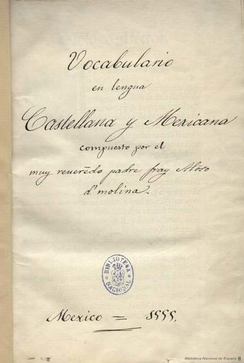 Keywords: Vocabulario lengua castellana y mexicana Molina 1555.jpg es Aqui comiença un vocabulario de la lengua Castellana y Mexicana Texto impreso / compuesto por el padre fray Alonso de Molina - Imprimiose en Mexico en casa de Iuan de Pablos 1555 - 8 259 1 h 1 h de lám ; 4º Signatura R/8564 1555 http //bdh bne es/bnesearch/detalle/bdh0000047609 - Biblioteca Digital Hispánica Biblioteca Nacional de España Molina Alonso de n ca 1511 other versions BNE PD-old-100 Uploaded with UploadWizard Spanish language |