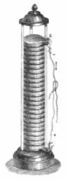 Keywords: Voltaic pile battery.png Drawing of Alessandro Volta's voltaic pile invented in 1800 the first electric battery It was built of many individual cells each consisting of a disk of copper and a disk of zinc or silver separated by a disk of cloth soaked in acid or brine A 23 cell pile like this would have produced around 36 volts Alterations removed caption Downloaded from http //books google com/books id BgM5AAAAMAAJ pg PA795 Adolphe Ganot 1893 Elementary Treatise on Physics Experimental and Applied 14th Ed William Wood Co New York p 795 fig 764 on Google Books Translated from Ganot's Éléments de Physique by E Atkinson 1893 Adolphe Ganot Public domain - Ganot died in 1887 PD-old Voltaic pile |