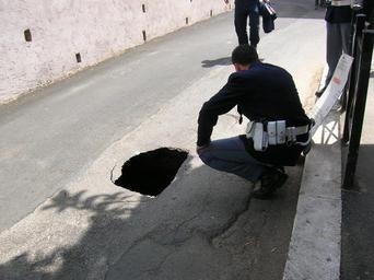 Keywords: Voragine 5.JPG Voragine in via del Pigneto Roma Own 2009-05-17 Patafisik Dominio Pubblico Pothole in Via del Pigneto Rome