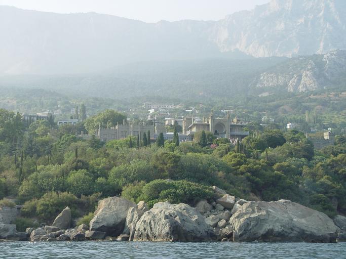 Keywords: Vorontsovsky palace seaside.JPG en View on Vorontsovsky palace in Alupka Crimea from sea ru Вид на Во онцовский дво ец с мо я own Eudjinnius 2007-08-01 18 20 28 Vorontsovsky Palace Crimea