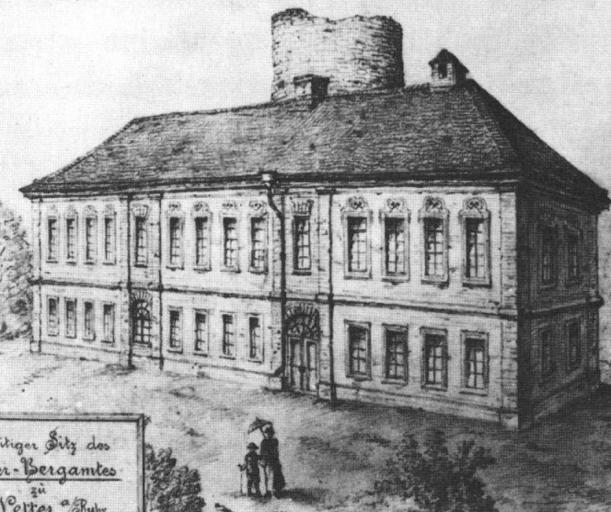 | Keywords: Vorzeitiger Sitz des Ober-Bergamtes zu Wetter Ende 18. Jh.jpg Zeichnung žVorzeitiger Sitz des Ober-Bergamtes zu Wetter a/Ruhr Ende des 18 Jahrhunderts “ Das Gebäude existiert nicht mehr Es befand sich im Bereich der Freiheit Wetter an den Ruinen der Burg Wetter deren Turm im Hintergrund erkennbar ist http //www lwl org/LWL/Kultur/Westfalen_Regional/Archiv/Wirtschaft/Bergaufsicht lwl org Geschichte der Bergaufsicht in Westfalen http //www lwl org/westfalen-regional-download/Abbildungen_Buch/S158_Abb_1 jpg S158_Abb_1 jpg between 1779 1792 author <br/> Foto ehemaliges Landesoberbergamt Dortmund PD-old Freiheit Wetter Burgturm Wetter History of Wetter Ruhr |