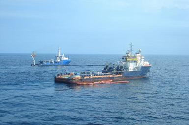 Keywords: VOSS on Seacor Vanguard in Gulf of Mexico 2010-05-16 1.jpg U S Navy Supervisor of Salvage and Diving personnel operate a Vessel of Opportunity Skimming System VOSS aboard the Naval Sea Systems command-contracted offshore supply vessel Seacor Vanguard to mitigate damage from the Deepwater Horizon oil spill Deepwater Horizon was an ultra-deepwater oil rig that sank April 22 causing a massive oil spill threatening the U S Gulf Coast http //www navy mil/view_image asp id 85636 2010-05-16 US Navy PD-USGov-Military-Navy Files by User BrokenSphere Deepwater Horizon oil spill response in the Gulf of Mexico Oil recovery vessels Oil containment booms Seacor Vanguard ship 1998 |