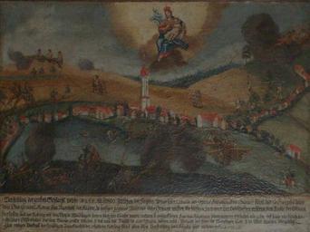 | Keywords: Votivbild Schlacht bei Meßkirch.JPG Meßkirch-Rohrdorf<br /> Votivimage about the Battle of Messkirch <br/> Meßkirch-Rohrdorf<br /> Votivbild der Schlacht bei Meßkirch <br/> Text Vorstellung der großen Schlacht welche den 5 te May 1800 zwischen der kayserl Armee unter Comando des General Feldzeugmaisters Baron v Kray und die Franzosen unter dem Ober General Moreau zum Nachtheil der Kayserl In hiesiger gegend Während dieser Schlacht mussten die hießigen Inwohner ihre Habschaften meistens dem Raube der Soldaten überlassen und ihre Rettung mit dem Vieh in Waldungen suchen Auch ihre Häuser waren in einem so erschröcklichen Feur und Kugelregen Durch mehrerer Stunden ausgesetz dass solche nur durch unmittelbare Hülfe Gottes vor dem Brande gerettet würden so man mit David im 126 t Psalm bekenen muß Bewacht der Herr die Wohnungen nicht so ist aller Wachen vergeblich Zum ewigen Denkmal der schuldigen Dankbarkeit der erhaltenen Rettung seind allen disen Vorstellung und Kugeln hier aubewehrt own photographed self at the church painter unknown <br/> photographer Manuel Heinemann early 19th century pd-old thumb Battle of Messkirch |