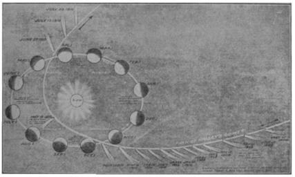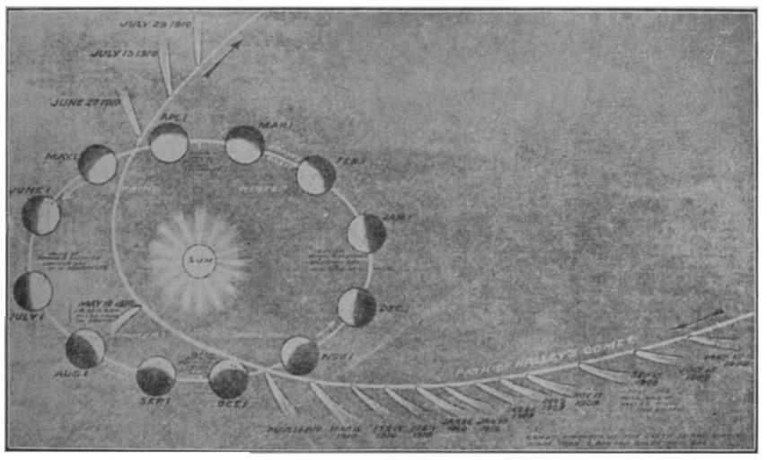 | Keywords: Voyage in Space page019.jpg  en How the Earth and Halley's Comet move round the Sun Taken from Illustrated London News for Sept 25 1909 A Voyage in Spacehttps //archive org/details/voyageinspacecou00turnrich Herbert Hall Turner 1913 1930 A Voyage in Space Orbits of comets Earth's orbit |
