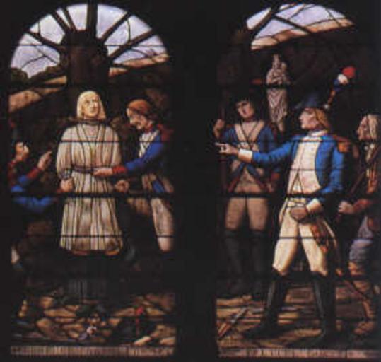 MAKE A MEME View Large Image Voyneau.jpg en Stained glass window of the Saint-Pierre church in Les-Lucs-sur-Boulogne presenting the martyrization of Louis Michel Voyneau by the French republican soldiers http //www loire-france com/histoire/guerres-vendee/vitraux/...