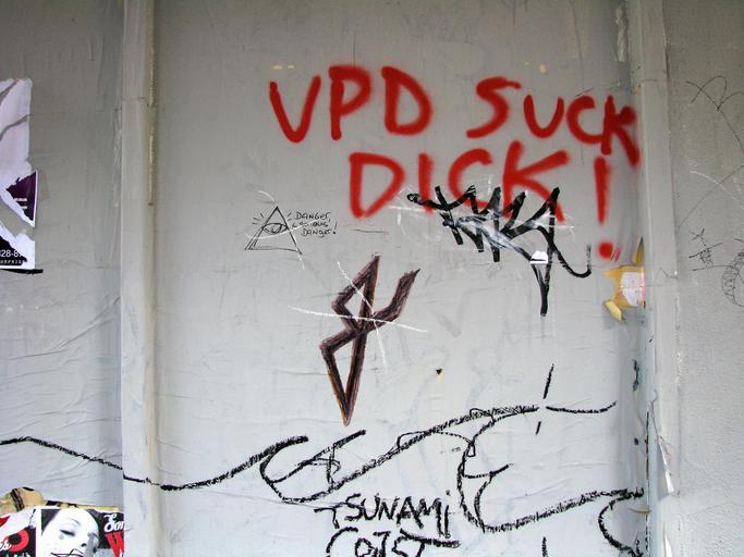 Keywords: VPD Suck Dick.jpg en Opinionated graffitum seen in the downtown eastside of Vancouver BC Canada own Name invalid 2008-05-15 Vancouver BC Canada Poverty in Vancouver Graffiti in Vancouver Text Sucks