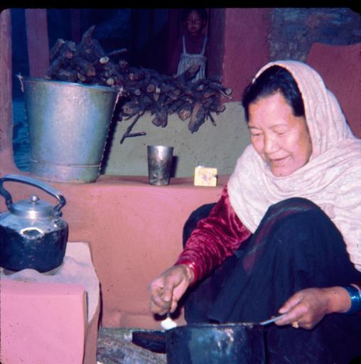 Keywords: batti commerce home life homelife kitchen tea shop teashop nepal Date: 1964-1965 Location: Tansen, Palpa Description: Woman preparing tea in her teashop along the Tansen-to-Pokhara trail. Date: 1964-1965 Location: Tansen, Palpa Description: Woman preparing tea in her teashop along the Tansen-to-Pokhara trail.