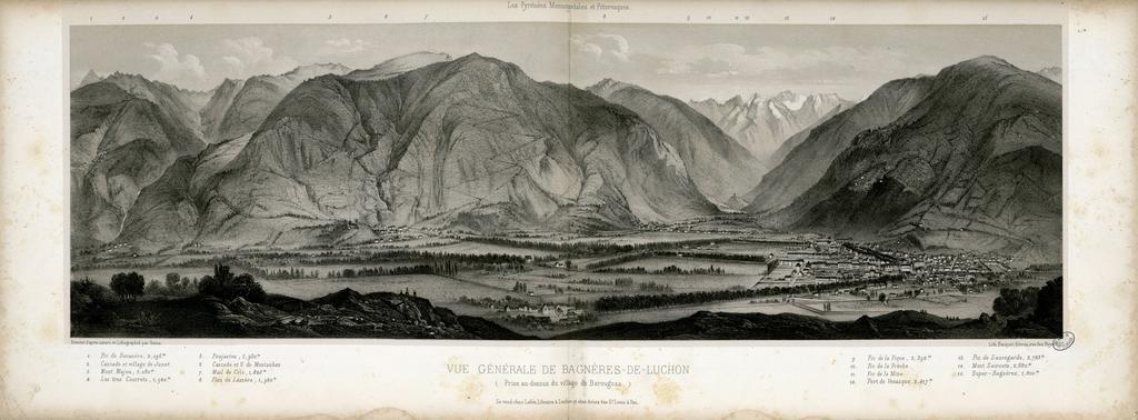 Keywords: Vue générale de Bagnères-de-Luchon (Prise au-dessus du village de Barcugnas) - Fonds Ancely - B315556101 A GORSE 3 004.jpg Fait partie d'un recueil de 23 lithographies en camaïeu sur fond bistre avec rehauts de blanc dont certaines doubles pl 9 16 17 21 et 23 - Titre lithographié avec vignette Pavillon de la Buvette - Planches dessinées et lithographiées par Gorse ; tirées chez Becquet frères à Paris ; se vendent chez Lafon Libraire à Luchon et pour certaines chez Ariza à Pau Sous le titre Les Pyrénées Monumentales et Pittoresques des albums à composition très variable ont été constitués certains contiennent des planches de costumes et ont des serpentes imprimées Les lithographies peuvent être en noir à deux teintes en camaïeux rare en couleurs; elles ont été reprises dans d'autres albums avec des titres divers Souvenirs pittoresques des Pyrénées Souvenirs de Luchon et ses environs Vues nouvelles de Luchon Guide-souvenir dans les Pyrénées dédié aux touristes etc Ancely René 1876 - 1966 Possesseur fre public domain domaine public B315556101_A_GORSE_3_004 jpg image/jpeg 1 f de pl lith dépl en camaïeu ; 27 cm oblong Becquet 18 - 18 ; imprimeur Lithographe Lafon Libraire http //numerique bibliotheque toulouse fr/collect/general/index/assoc//ark /74899/B315556101_A_GORSE_3_004 dir/B315556101_A_GORSE_3_004 jpg Bibliothèque municipale de Toulouse A-GORSE 3-2 Creator Pierre Gorse http //catalogues toulouse fr/web2/tramp2 exe/do_keyword_search/log_in setting_key BMT1 servers 1home query p000649 vignette http //numerique bibliotheque toulouse fr/collect/general/index/assoc//ark /74899/B315556101_A_GORSE_3_004 dir/B315556101_A_GORSE_3_004_thumb jpeg by 1873 Vue générale de Bagnères-de-Luchon Prise au-dessus du village de Barcugnas B315556101_A_GORSE_3_004 lithography - engraving Bagnères-de-Luchon Vallée de Luchon Mountains of France in art Valleys in art Pierre Gorse Houses in art Mountains of Haute-Garonne Bagnères-de-Luchon in art |