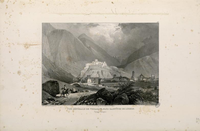 | Keywords: Vue générale de Venasque, près de Bagnères de Luchon (Espagne - Arragon) - Fonds Ancely - B315556101 A JACOTTET 1 053.jpg Fait partie de la première partie d'un recueil de planches lithographiées Titre lithographié et 50 lithographies numérotées de 1 à 50 plus 4 lithographies supplémentaires numérotées de 1 à 3 ici pl 53 54 55 et une sans numéro ici pl 52 Deux planches sont numérotées 10 ce qui fait en tout un album de 55 pl L'ouvrage de Jacottet est très rare quand il est complet des deux parties Vignette lithographiée au titre Visite aux ruines de Beaucens Vallée d'Argelez Hautes Pyrénées Ancely René 1876 - 1966 Possesseur fre public domain domaine public B315556101_A_JACOTTET_1_053 jpg image/jpeg 1 f de pl lithogr ; 53 5 cm Bayot Adolphe Jean Baptiste 1810-18 Illustrateur Gihaut Jean Editeur Gihaut Michel-Ange 1800-1871 Editeur Jalon Editeur Paris Ed Illustrateur http //numerique bibliotheque toulouse fr/collect/general/index/assoc//ark /74899/B315556101_A_JACOTTET_1_053 dir/B315556101_A_JACOTTET_1_053 jpg Bibliothèque municipale de Toulouse A-JACOTTET 1-51 Creator Louis-Julien Jacottet http //catalogues toulouse fr/web2/tramp2 exe/do_keyword_search/log_in setting_key BMT1 servers 1home query p001077 vignette http //numerique bibliotheque toulouse fr/collect/general/index/assoc//ark /74899/B315556101_A_JACOTTET_1_053 dir/B315556101_A_JACOTTET_1_053_thumb jpeg between 1835 1836 Vue générale de Venasque près de Bagnères de Luchon Espagne - Arragon B315556101_A_JACOTTET_1_053 lithography - print Women in art Castles in art Ramparts Fortifications History of Pyrénées Animal-powered transport in art Province of Huesca Donkeys in art Bridges in art Towers in art Churches in art Mounds Louis-Julien Jacottet Bell towers in art Benasque Roads in art Men in art Houses in art |