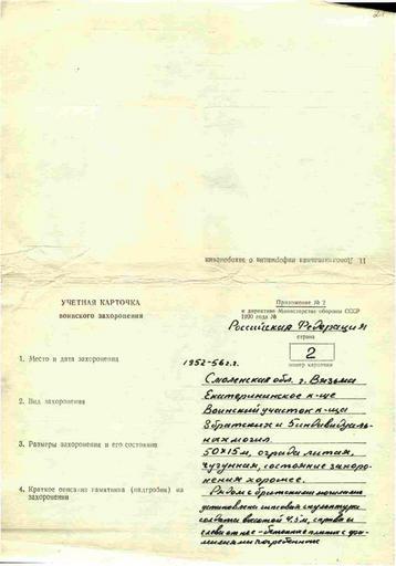Keywords: Vyazma Bed of Honor identification card, page 1.jpg en Vyazma Bed of Honor identification card page 1 ru Учётная ка точка захо онения на Екате ининском кладбище в Вязьме ст аница 1 http //www obd-memorial ru/Image2/getimage id 261296169 Ministry of Defence of the Soviet Union thumb left Page 2 Vyazma Mikhail Efremov PD-RU-exempt |