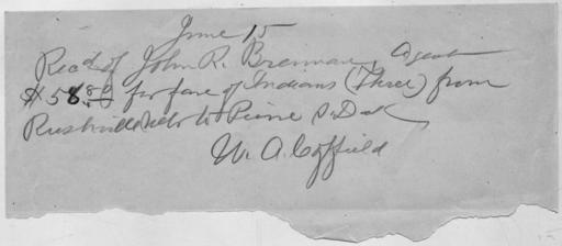 | Keywords: W.A. Coffield to John R. Brennan - NARA - 285003.tif Scope and content This is document pertains to Murder of Pugh Brave Heart April 12 1907 to July 3 1907 General notes Receipt for train fare of three Indians from Rushville Nebraska to Pierre South Dakota 285003 Local identifier Department of the Interior Office of Indian Affairs Pine Ridge Agency 1878 - 09/17/1947 NARA's Central Plains Region Kansas City NREA 400 West Pershing Road Kansas City MO 64108 1907-06-15 Record group Record Group 75 Records of the Bureau of Indian Affairs 1793 - 1999 Record group ARC 404 Records of Controversies compiled 04/01/1867 - 1879 Series ARC 284971 File unit Murder of Pugh Brave Heart 04/12/1907 - 07/03/1907 File unit ARC 284989 Variant control numbers NAIL Control Number NRE-75-67-BB-14 yes Other versions NARA-cooperation PD-USGov Documents in English |