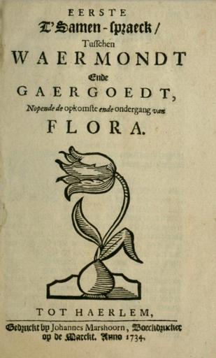 Keywords: Waermondt and Gaergodt 1734 edition.png Лист из Пе вого диалога Ва мондта и Га гудта издание 1734 года Ха лем Opening page of the First Dialogue of Waermondt and Gaergoedt 1734 edition https //archive org/details/dedrietzamenspra00haer 1734 Text presumed to be written by Adriaen Roman illustrator unknown PD Title page of the same boook File Waermondt gaergoedt small-2 tif PD-Old-100 Tulipomania 1734 books Tulips in drawings
