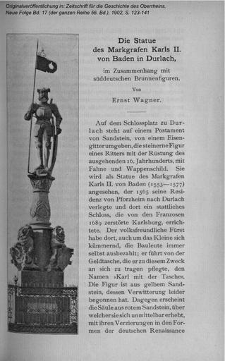 | Keywords: Wagner Die Statue des Markgrafen 01.jpg Ernst Wagner Die Statue des Markgrafen Karls II von Baden in Durlach im Zusammenhang mit süddeutschen Brunnenfiguren in Zeitschrift für die Geschichte des Oberrheins Neue Folge Bd 17 der ganzen Reihe 56 Bd 1902 S 123-141 Series title 1902 Karlsruhe http //archiv ub uni-heidelberg de/artdok/volltexte/2010/1037/ ART-Dok Uni Heidelberg PD-old Other versions Die Statue des Markgrafen Wagner Statues in Karlsruhe | ||||