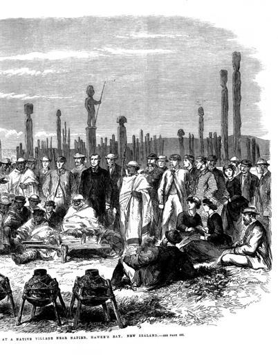 | Keywords: Waikato - 002a.PNG from Page 446 of the October 31 1863 Illustrated London News MEETING OF SETTLERS AND MAORIS AT HAWKE'S BAY NEW ZEALAND The Engraving on page 436 represents a large meeting of the European and Maori inhabitants of the province of Hawke's Bay New Zealand held at the Pah Whakairo a native village about ten miles from Napier on the 20th of July last It is taken from several views of the meeting photographed by Mr Charles H Robson Mr Grindle Government interpreter at Napier has obligingly furnished us with some particulars of the meeting and of the condition and general conduct of the Maoris in that settlement at this juncture full of interest Throughout the whole of the disturbances so frequent of late years in New Zealand he says that the natives of that part of the country have always maintained the strictest neutrality and evinced an earnest desire to cultivate the good will and friendship of the settlers Even in times of strife and bloodshed their conduct has ever been marked by an anxiety to respect the lives and property of their white neighbours This feeling was strongly exemplified in the years 1857-8 during the feud between the Hapuku and the Moananui two rival chiefs of the province At that period although the contending tribes were often hard-pushed for provisions the sheep and cattle of the settlers grazed quietly in the vicinity of the fortified villages and not a single one was ever known to be missing; and the settlers themselves were earnestly warned to avoid approaching too near the contending parties whilst engaged lest some one might be injured by a stray bullet This quarrel had its origin in disputes and jealousies arising from the sale by one of the chiefs in question of blocks of land to the Government which according to native custom implicated the Government also as the purchasing party Their conduct therefore towards the settlers on that occasion certainly evinced a remarkable degree of forbearance for men of untutored minds sic At a later date when the famous King movement was fast gaining ground and many tribes were pledged to is support these people although professedly in favour of the movement uniformly retained their resolution to preserve peaceful relations with their European neighbours And at the present crisis in New Zealand whilst the powerful and warlike tribes of the Waikatos with whom the King movement originated are at war with the Government and their emissaries continually traversing the country exciting and urging the tribes to revolt the people of Hawke's bay remain steady in their resolution to preserve peace in their own district and publicly declare that although morally supporting the confederation of the tribes for the maintenance of their nationality they will if necessary resist by force any attempt of other tribes to disturb the peace of the province The meeting represented in our Engraving was called for the purpose of celebrating the completion of a large flour mill erected by the natives of the district with the assistance of the Government at the Pawhakairo village The Europeans were invited to attend to afford each party an opportunity of expressing to the other their doubts and fears in the present aspect of affairs in the country A large company assembled amongst whom were many ladies and gentlemen from the town of Napier and Donald M'Lean Esq the Superintendent of the Province This gentleman was for many years at the head of the Native Department under the general Government of the colony and is a man of great experience in all matters affecting the natives Possessing the entire confidence of both races and a perfect knowledge of the Maori language and character no man could be better adapted to allay the feelings of distrust naturally awakened in the breasts of these bold and warlike people by the stirring events passing in other parts of the colony Many chiefs representatives of various tribes addressed the meeting and all expressed their unaltered determination to live in peace and amity with their white neighbours But they said the measures then being taken by the local Government gave them much uneasiness Why said they are stockades being erected and men being drilled There can be no necessity for these preparations here We have always been your friends and have never given you cause to be suspicious of us nor have we ever mistrusted you; but now we are in doubt as to the meaning of these proceedings They were answered by his Honour the Superintendent who informed them that the militia were called out pursuant to instructions from the Governor; that this was usual amongst Englishmen in every country even in times of peace; that it had already been done in every other province in the island; that warning letters were continually being received from loyal natives in other districts of meditated attacks upon the town of Napier by the Waikatos now in arms against the Government together with other disaffected tribes; and that the stockades therefore and all the other preparations had no reference whatsoever to them but were merely precautionary measures to guard against threatened incursions of hostile tribes His Honour spoke at some length and the result was that the natives were fully satisfied and a paper was drawn up by them and signed by all the principal chiefs declaring their fixed determination to maintain peace in the province and to assist the Pakehas in repelling any hostile tribes This together with the speeches of the chiefs was afterwards published in a local newspaper printed in the Maori language called the Waka Maori o Ahuriri or the Maori Canoe of Ahuriri The gentleman near the centre of the engraving with his head uncovered is Mr M'Lean the Superintendent of the province At his feet is an aged chief named Porokuru seated in a wheelbarrow in which he had been conveyed to the spot being unable either to walk or stand erect from age and decrepitude He was the first to address the meeti