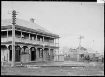 Keywords: blackandwhite monochrome outdoor architecture building photo border black and white View of the Waipa Hotel (proprietor S. Draffin), and Jesmond Street, Ngaruawahia. Photographed by R.S.F. (probably Robert Stanley Fleming, storekeeper of the Novelty Depot). The business premises of the Novelty Depot are visible centre right, behind a horse and cart. Inscriptions: Inscribed - Photographer's title on negative -bottom left: Jesmond St. Ngaruawahia. 24.bottom right: R.S.F. Protd 1.8.10. Quantity: 1 b&w original negative(s). Physical Description: Dry plate glass negative 4.5 x 6.5 inches Fleming, Robert Stanley, fl 1910-1915. Waipa Hotel and Jesmond Street, Ngaruawahia, 1910 - Photograph taken by Robert Stanley Fleming. Price, William Archer, 1866-1948 :Collection of post card negatives. Ref: 1/2-001603-G. Alexander Turnbull Library, Wellington, New Zealand. natlib.govt.nz/records/22308698 View of the Waipa Hotel (proprietor S. Draffin), and Jesmond Street, Ngaruawahia. Photographed by R.S.F. (probably Robert Stanley Fleming, storekeeper of the Novelty Depot). The business premises of the Novelty Depot are visible centre right, behind a horse and cart. Inscriptions: Inscribed - Photographer's title on negative -bottom left: Jesmond St. Ngaruawahia. 24.bottom right: R.S.F. Protd 1.8.10. Quantity: 1 b&w original negative(s). Physical Description: Dry plate glass negative 4.5 x 6.5 inches Fleming, Robert Stanley, fl 1910-1915. Waipa Hotel and Jesmond Street, Ngaruawahia, 1910 - Photograph taken by Robert Stanley Fleming. Price, William Archer, 1866-1948 :Collection of post card negatives. Ref: 1/2-001603-G. Alexander Turnbull Library, Wellington, New Zealand. natlib.govt.nz/records/22308698 |