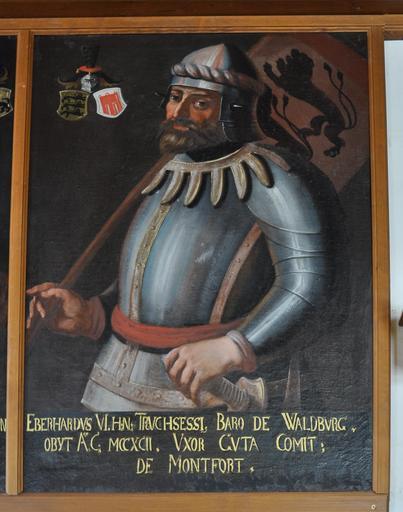 Keywords: Waldburg Rittersaal Portrait 08.jpg Burg Waldburg Württemberg Porträtgalerie im Rittersaal Gemälde von Franz Joseph Müller um 1780; Porträt laut Inschrift Eberhard VI starb 1292 Ehefrau Guta von Montfort; gemeint wohl Eberhard II v Waldburg ca 1260-1291 oo Elisabeth von Montfort own own photograph 2013-05-05 Paintings Franz Joseph Müller; Photo Andreas Praefcke File Truchsessenchronik Cod Don 590 134 jpg Photos by User AndreasPraefcke Paintings in the Waldburg Rittersaal Waldburg Eberhard II von Waldburg Franz Joseph Müller painter Coats of arms of Montfort |