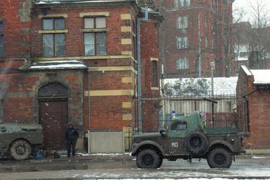 Keywords: Wałęsa filmmaking (14).JPG en Wałęsa the movie set in Gdańsk own Artur Andrzej 2012-01-14 Cc-zero Wałęsa 2 Podwale Grodzkie Street in Gdańsk Citizens' Militia in People's Republic of Poland automobiles UAZ-69 BRDM-2 in Polish service