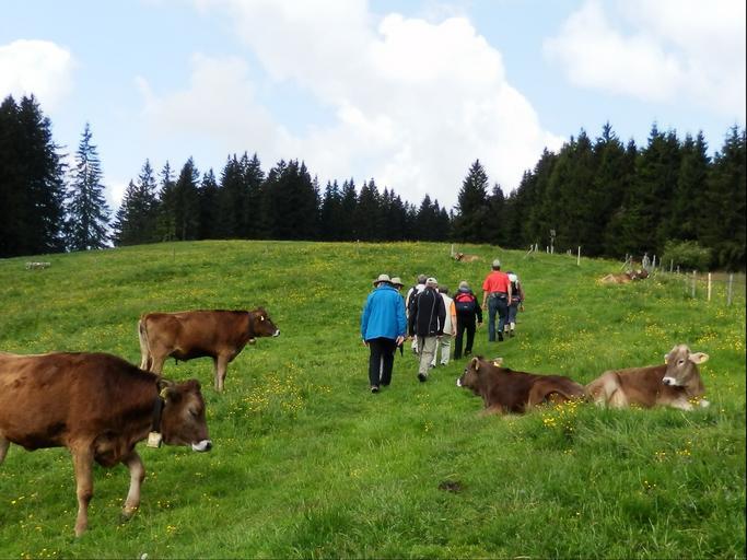 Keywords: wanderer allgäu hiking mountain hike mountain meadow meadow pasture cow cows cattle nature sky
