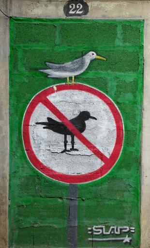 Keywords: wall painting wandmalerei madeira funchal outdoor grün green bird vogel verbotssschild hinweisschild text sign photo border drawing