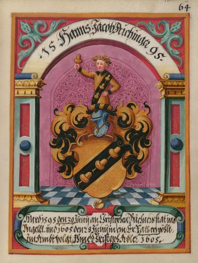 | Keywords: Wappenbuch Ungeldamt Regensburg 064r.jpg Wappenbuch des Ungeldamtes Regensburg Stadtarchiv Ravensburg Wappen der Assessoren des Ungeldamtes Hanns Jacob Aichinger http //gams uni-graz at/o rpb band12 1595 anonymous PD-old-100 Wappenbuch des Ungeldamtes Regensburg Coats of arms of Aichinger family |
