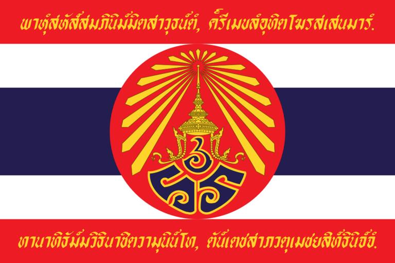| Keywords: War flag of Thailand (World War I-Reverse).svg Cleanup image Needs better font See https //i ytimg com/vi/CIakhxHLgL4/hqdefault jpg this picture of the original flag for example <poem> พาหุํสหัส์สมภินิม์มิตสาวุธน์ตํ ค๎รี มขลํอุทิตโฆรส สนมารํ ทานาทิธัม์มวิธินาชิตวามุนิน์โท ตัน์ ตชสาภวตุ มชยสิทธินิจ์จํ </poem> <poem> Bāhuṃ sahassam-abhinimmita sāvudhan taṃ grīmekhalaṃ uditaghora sasenamāraṃ Dānādadhammavidhinā jitavā munindo tan tejasā bhavatu me jayasiddhiniccaṃ </poem> The entire poem can be read on Thai Wikisource พุทธชัยมงคลคาถา modern orthography Thanks for original image from http //www tv5 co th/service/mod/heritage/nation/military/flag/index2 htm Thai Heritage Museum and Xiengyod's Site http //www bloggang com/data/xiengyod/picture/1187382211 jpg http //www bloggang com/data/xiengyod/picture/1187382088 jpg พระบาทสม ด็จพระรามาธิบดีศรีสิรินทร มหาวชิราวุธฯ พระมงกุฎ กล้า จ้าอยู่หัว พระราชทานแก่ทหารไทยที่ไปปฏิบัติราชการสงครามในสงครามโลกครั้งที่ ๑ ณ ทวีปยุโรป ภาพธงนี้ ดิมกำหนดให้ ป็นด้านหน้า แต่ มื่อติดกับด้ามธงแล้ว ด้ามธงอยู่ด้านขวาของ ืนธงด้านนี้ ดังนั้น ภาพธงนี้จึง ป็นธงด้านหลังตามหลักสากลนิยม <br /> ลักษณะของธงด้านนี้ ป็นธงขนาดอัตราส่วน ๒ ต่อ ๓ แบบธงไตรรงค์ ตรงกลาง ืนธงมีวงกลมสีแดงกว้างจรดขอบสีแดงด้านนอกของธงไตรรงค์ ภายในมีอักษรพระปรมาภิไธยย่อ ร ร และ ลข ๖ หมายถึง รามวชิราวุธที่ ๖ อยู่ภายใต้พระมหาพิชัยมงกุฎ ปล่งรัศมีสี หลือง ขอบสีแดงด้านนอกของ ืนธง จารึกบทย่อของชัยมงคลคาถา พาหุงสหสฺสมภินิมฺมิตสาวุธนฺตํ ครี มขลํอุทิตโฆรส สนมารํ ทานาทิธมฺมวิธินาชิตวามุนินโท ตนฺ ตชสาภวตุ มชยสิทธินิจจํ ปัจจุบันธงนี้ ลิกใช้แล้ว 40px40px40px40px40px Own Tangmo 2007-03-23 insignia <gallery> File War flag of Thailand World War I-Obverse svg Obverse side of the flag </gallery> War flags Thailand Colours of the Siamese Expeditionary Force in World War I SVG flags - military of Thailand SVG flags - historical of Thailand Pali language Royal monograms of King Rama VI |