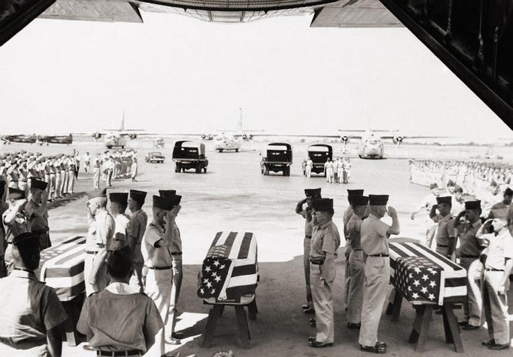 | Keywords: Caskets containing the bodies of seven American helicopter crewmen killed in a crash on January 11, 1963 were loaded aboard a plane on Monday, Jan. 14 for shipment home. The crewmen were on board a H21 helicopter that crashed near a hut on an Island in the middle of one of the branches of the Mekong River, about 55 miles Southwest of Saigon. (AP Photo) vnm flag military respect standing stars strips transportation | ||||