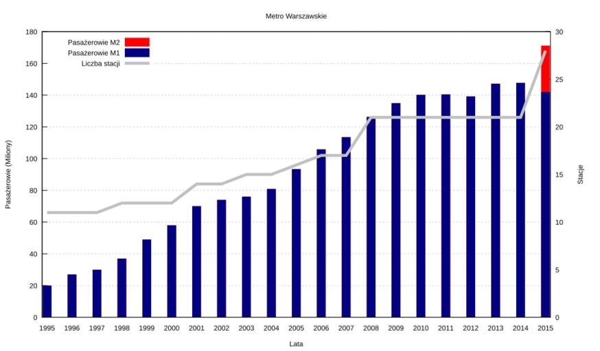 | Keywords: Warsaw-Metro-Passengers-pl.svg Metro warszawskie liczba pasażerów i stacji http //www metro waw pl/pliki/aktualnosci/2016/rr2015/rr2015 pdf Raport Roczny Metra Warszawskiego 2015 File talk Warsaw-Metro-Passengers-en svg zawiera dane i skrypt gnuplot Sliwers 2016-10-30 File Warsaw-Metro-Passengers-en svg Created with Gnuplot Metro in Warsaw “ charts |