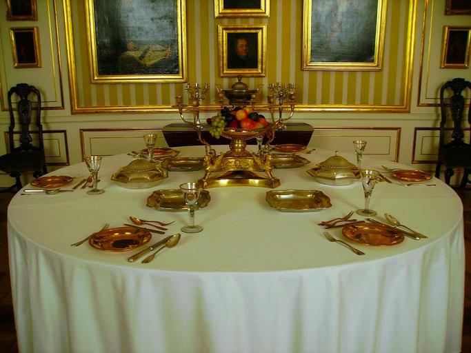 | Keywords: Warsaw Royal Castle GM (20).JPG - Gate-leg table mahogany England 1750 On the table - Centerpiece silver gift master PC London 1801-1802 - Four bowls silver Teodor Pawlowicz Warsaw 1784-94; The Ciechanowiecki Foundation Collection - Pair of bowls with covers silver Teodor Pawlowicz Warsaw 1789 - Six dessert plates gilded brass silver XIX century The Ciechanowiecki Foundation Collection - Six spoons knives and forks silver Paris 1819-1838; The Ciechanowiecki Foundation Collection - Six spoons knives and forks gilded brass XIX century; The Ciechanowiecki Foundation Collection - Six goblets glass Poland c 1800 The Ciechanowiecki Foundation Collection - Eight-lights chandelier Central Europe c 1750; bequeated by Tadeusz Wierzejski Own 2008-06 Giorgiomonteforti Own work all rights released Public domain Wallpapered rooms Round tables Dining tables Table settings Silver tableware Centrepiece tableware Silverware from England Silverware from Poland Silverware from France Yellow Room Royal Castle Warsaw |