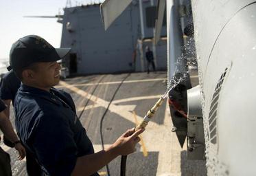 Keywords: Washing salt water 140303-N-MY642-029.jpg en Aviation Structural Mechanic 2nd Class Romgloyd Rivera washes salt water from an MH-60R Sea Hawk helicopter on the flight deck of the guided-missile destroyer USS Bulkeley DDG 84 Bulkeley is deployed as part of the Harry S Truman Carrier Strike Group supporting maritime security operations and theater security cooperation efforts in the U S 5th Fleet area of responsibility U S Navy photo by Mass Communication Specialist 2nd Class Donald R White Jr /Released 2014-03-03 Seaman Donald R White https //www dvidshub net/image/1181387 140303-N-MY642-029 2014-03-07 10 05 GU PD-USGov-Military-Navy USS Bulkeley DDG-84 Images from DoD uploaded by Fæ |