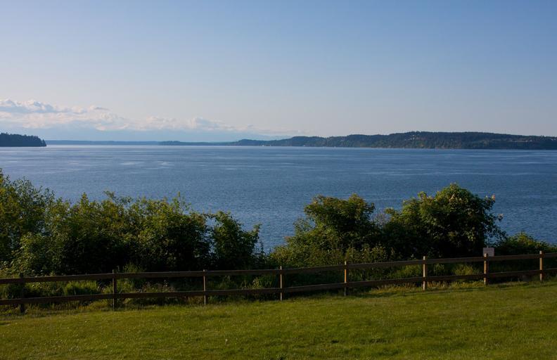 Keywords: washington state united states usa bay water sky clouds hazy trees grass tranquil calmness beautiful calming serene coast