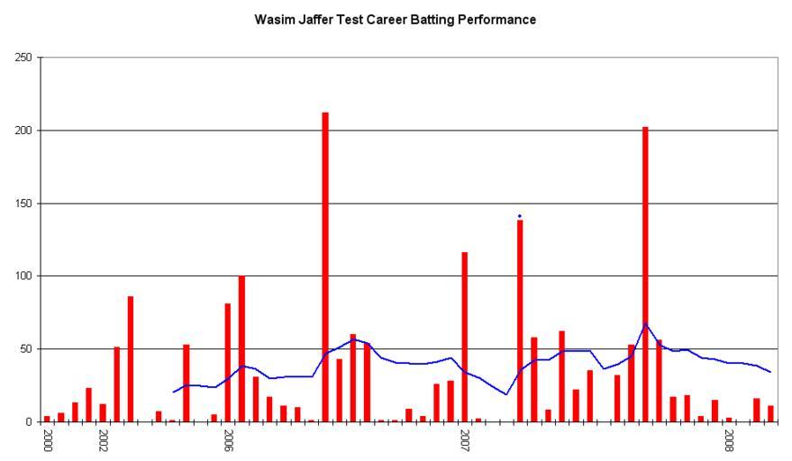 | Keywords: Wasim Jaffer graph.png Test Match performance of Wasim Jaffer It was created by Raven4x4x The red bars indicate the player's test match innings while the blue line shows the average of the ten most recent innings at that point Note that this average cannot be calculated for the first nine innings The blue dots indicate innings in which Jaffer finished not-out This graph was generated with Microsoft Excel 2002 using data from Cricinfo http //stats cricinfo com/statsguru/engine/player/29646 html class 1;orderby start;template results;type batting;view innings and Howstat http //www howstat com au/cricket/Statistics/Players/PlayerProgressBat asp PlayerID 2208 The information in this chart is current as of 2 February 2008 2008-2-2 Own <br />Transferred from http //en wikipedia org en wikipedia Raven4x4x at http //en wikipedia org en wikipedia en wikipedia Raven4x4x original upload log page en wikipedia Wasim_Jaffer_graph png 2008-02-02 08 04 Raven4x4x 986×574 4606 bytes <nowiki>This graph details the Test Match performance of Wasim Jaffer It was created by Raven4x4x The red bars indicate the player's test match innings while the blue line shows the average of the ten</nowiki> DEFAULTSORT Jaffer Wasim 1978 births Test cricketers graphs of India Cricketers from Maharashtra |