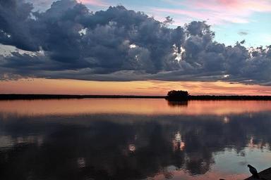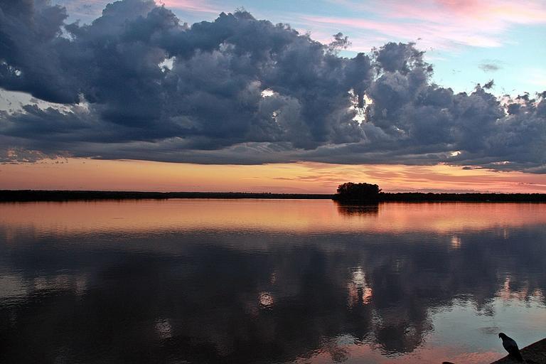 Keywords: water reflection bird pond sunset sky clouds outdoors scenic tranquil weather meteorology cloudscape environment nature cloudy