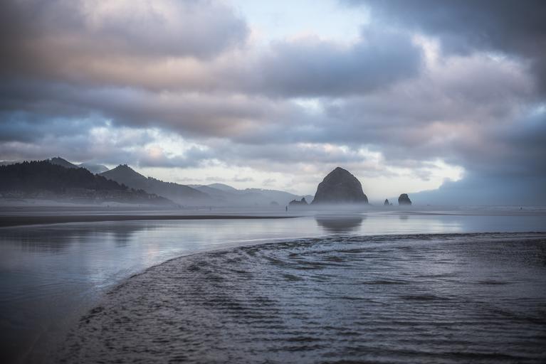 Keywords: water ripple coast shore ocean sea trace boat island rocks cliffs view cloudscape reflection surface misty scene