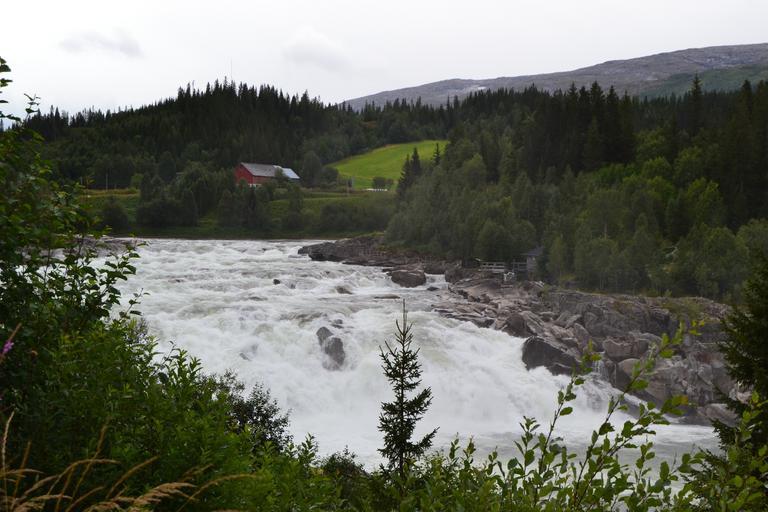Keywords: waterfall norway vefsna mountains forest fields village cottage water power