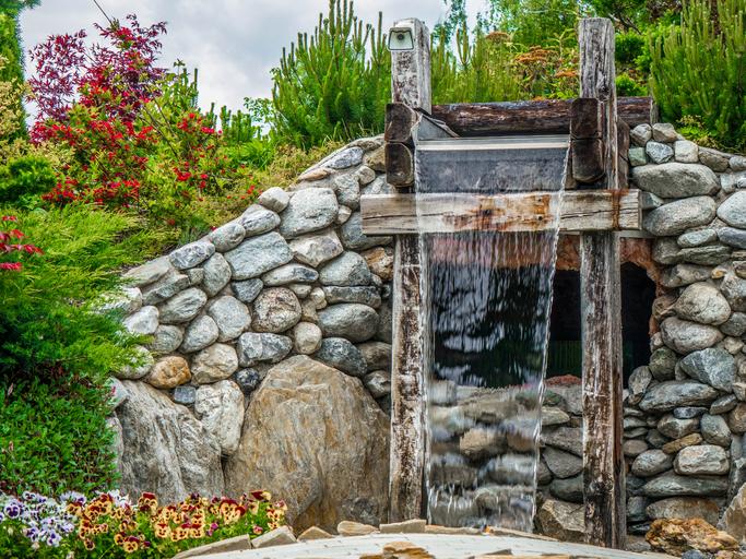 Keywords: waterfall stones plant wood rock stone fouling overgrown rock wall