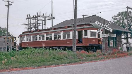 | Keywords: outdoor vehicle railroad train locomotive Roger Puta with his camera was in Iowa the weekend of June 22 and 23 1963. The Iowa Chapter of the NRHS was throwing a multi electric car event. In this photo WCF&N 100 had just arrived at the Monrovia, IA station of the Southern Iowa Ry. Note Cross bucks in foreground; freight motor, and substation to left. Roger Puta with his camera was in Iowa the weekend of June 22 and 23 1963. The Iowa Chapter of the NRHS was throwing a multi electric car event. In this photo WCF&N 100 had just arrived at the Monrovia, IA station of the Southern Iowa Ry. Note Cross bucks in foreground; freight motor, and substation to left. Roger Puta with his camera was in Iowa the weekend of June 22 and 23 1963. The Iowa Chapter of the NRHS was throwing a multi electric car event.