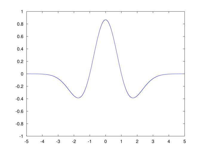 Keywords: Wavelet Mexican Hat.svg en Mexican Hat Wavelet own Andrew hammett 2011-02-17 File Wavelet - Mex Hat png Source code Created on MATLAB version 7 11 0 using the Wavelet toolbox wavelet 'mexh' iterated 20 times to produce 1048576 data points in the x-range -8 8 only 655360 of these points are shown points in -5 5 Command sequence y x wavefun 'mexh' 20 ; plot x y axis -5 5 -1 1 set gcf 'color' 'white' Cc-zero Wavelets