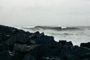 Keywords: waves ocean sea water rocks boulders coast cloudy sky