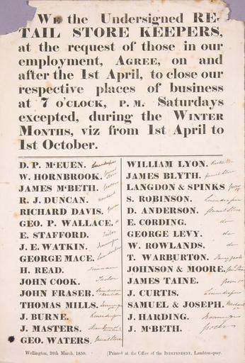 Keywords: document text outdoor Lists 31 retail storekeepers (mainly operating in Lambton Quay) who agreed to this closing time.: D.P M`Euen (linen draper), W. Hornbrook (general store), James M`Beth (grocer), R.J. Duncan (merchant), Richard Davis (grocer), Geo. P. Wallace (grocer), E. Stafford (tailor), J.E. Watkin (ironmonger), George Mace (linen draper), H. Read (tinman), John Cook (tailor), John Fraser (linen draper and haircutter), Thomas Mills (ironmonger), J. Burne (linen draper), J. Masters (straw bonnet maker), Geo. Waters (general store), William Lyon (bookseller), James Blyth (general store), Langdon & Spinks (grocer), S. Robinson (linen draper), D. Anderson (general store), E. Cording (general store), George Levy (general store), W. Rowlands (general store), T. Warburton (fancy goods), Johnson & Moore (general store), James Taine (grocer), J. Curtis (linen draper), Samuel & Joseph (merchants), J. Harding (ironmonger), J. M`Beth (grocer). Inscriptions: Inscribed - Recto - (Handwritten in ink after each signatory's name): [type of shop].. Many of the listed retailers operated in Lambton Quay in 1850-51. Quantity: 1 b&w art print(s). Physical Description: Woodblock, 327 x 220 mm. We the undersigned RETAIL STORE KEEPERS, at the request of those in our employment, Agree, on and after 1st April, to close our respective places of business at 7 o'clock, P.M. Saturdays excepted, during the WINTER MONTHS, viz from 1st April to 1st October. 28th March, 1850.. Ref: Eph-B-RETAIL-1850-01. Alexander Turnbull Library, Wellington, New Zealand. natlib.govt.nz/records/22308484 Lists 31 retail storekeepers (mainly operating in Lambton Quay) who agreed to this closing time.: D.P M`Euen (linen draper), W. Hornbrook (general store), James M`Beth (grocer), R.J. Duncan (merchant), Richard Davis (grocer), Geo. P. Wallace (grocer), E. Stafford (tailor), J.E. Watkin (ironmonger), George Mace (linen draper), H. Read (tinman), John Cook (tailor), John Fraser (linen draper and haircutter), Thomas Mills (ironmonger), J. Burne (linen draper), J. Masters (straw bonnet maker), Geo. Waters (general store), William Lyon (bookseller), James Blyth (general store), Langdon & Spinks (grocer), S. Robinson (linen draper), D. Anderson (general store), E. Cording (general store), George Levy (general store), W. Rowlands (general store), T. Warburton (fancy goods), Johnson & Moore (general store), James Taine (grocer), J. Curtis (linen draper), Samuel & Joseph (merchants), J. Harding (ironmonger), J. M`Beth (grocer). Inscriptions: Inscribed - Recto - (Handwritten in ink after each signatory's name): [type of shop].. Many of the listed retailers operated in Lambton Quay in 1850-51. Quantity: 1 b&w art print(s). Physical Description: Woodblock, 327 x 220 mm. We the undersigned RETAIL STORE KEEPERS, at the request of those in our employment, Agree, on and after 1st April, to close our respective places of business at 7 o'clock, P.M. Saturdays excepted, during the WINTER MONTHS, viz from 1st April to 1st October. 28th March, 1850.. Ref: Eph-B-RETAIL-1850-01. Alexander Turnbull Library, Wellington, New Zealand. natlib.govt.nz/records/22308484 |