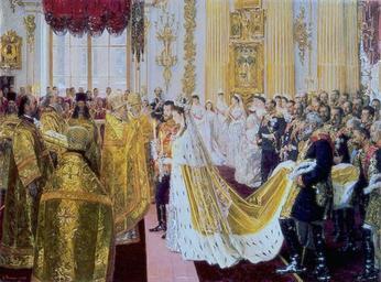 | Keywords: Wedding of Nicholas II and Alexandra Feodorovna by Laurits Tuxen (1895-6, Royal coll.).jpg The Marriage of Nicholas II Tsar of Russia 26th November 1894 Princess Alix of Hesse 1872-1918 was Queen Victoria ™s granddaughter She married Nicholas II Tsar of Russia on 26 November 1894 in the Imperial Chapel of the Winter Palace Here the bridegroom and bride are holding lighted candles and the Metropolitan Archbishop of St Petersburg makes the sign of the cross before them with their engagement rings The Tsar is in Hussar uniform and the bride wears a diamond crown and the Imperial gold-embroidered mantle lined with ermine The orange blossom was brought from the Imperial conservatory in Warsaw Tuxen attended the ceremony and recorded how he was intoxicated by the beauty of the scene by the singing the richness of the colours the light the golden fabrics and the loveliness of the bride It is interesting to compare this painting with Nicolas Chevalier ™s painting of the marriage of the Tsar ™s aunt in the same chapel 20 years earlier RCIN 404476 Signed and dated L Tuxen 1895-6 http //www royalcollection org uk/collection/404465/the-marriage-of-nicholas-ii-tsar-of-russia-26th-november-1894 or 1895 1896 Creator Laurits Tuxen PD-old-auto 1927 Wedding of Nicholas II of Russia and Alexandra Feodorovna Alix of Hesse Maria Fyodorovna Dagmar of Denmark in documentary paintings Ž Russian royalty by Laurits Tuxen Wedding ceremonies in paintings Ermine clothing in art Images from the Royal Collection of the United Kingdom |