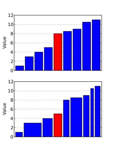 | Keywords: Weighted median.svg en Two charts showing the difference between an ordinary median and a weighted median The weight of the element in the list is are indicated by the widths of the boxes and the value by height The median element is shown in red 2013-12-02 21 17 28 own Bscan <source lang 'matlab'> Python code shown below This code is issued under the Creative Commons CC0 License from pylab import Arbitrary values that result in a good illustrative example data array 1 3 4 5 8 8 5 9 10 5 11 weights array 0 24 0 60 0 33 0 28 0 2 0 39 0 2 0 1 0 18 bar_spacing 0 02 Distance between adjacent bars Non-medians are blue and the median is red colors 'b' 'b' 'b' 'b' 'r' 'b' 'b' 'b' 'b' colorsw 'b' 'b' 'b' 'r' 'b' 'b' 'b' 'b' 'b' normalize the weights only needed to get the two plots to line up weights weights / sum weights unweights ones data __len__ /data __len__ Equal weighting The locations start at zero and are spaced by the width locations concatenate array 0 cumsum bar_spacing + unweights -1 locations_w concatenate array 0 cumsum bar_spacing + weights -1 figure subplot 2 1 1 bar locations data width unweights color colors ylabel 'Value' tick_params axis 'x' which 'both' bottom 'off' top 'off' labelbottom 'off' xlim -0 02 sum unweights+0 02 grid xticks subplot 2 1 2 bar locations_w data width weights color colorsw ylabel 'Value' tick_params axis 'x' which 'both' bottom 'off' top 'off' labelbottom 'off' xlim -0 02 sum weights+0 02 grid xticks </source> cc-zero Uploaded with UploadWizard Statistical charts |