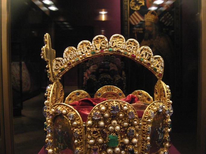 | Keywords: Weltliche Schatzkammer Wien (176).JPG Die Reichskrone Westdeutsch 2 H 10 Jahrhundert; das Kronenkreuz einer Hinzufügung des frühen 11 Jahrhunderts; der Bügel aus der Zeit Kaiser Konrads II 1024-1039 ; die rote Samthaube aus dem 18 Jahrhundert Gold Email Zellenschmelz Edelsteine Perlen Stirnplatte H 14 9 cm B 11 2 cm ; Kronenkreuz H 9 9 cm SK Inv -Nr XIII 1 The Imperial Crown Western Germany 2nd half of the 10th century The cross is an addition from the early 11th century; the arch dates from the reign of Emperor Conrad II ruled 1024-1039 ; the red velvet cap is from the 18th century Gold cloisonné enamel precious stones pearls Brow plate H 14 9 cm W 11 2 cm; cross H 9 9 cm SK Inv No XIII 1 Own 2007-10 MyName Gryffindor part of panorama Weltliche Schatzkammer Wien 176 pano jpg Secular and Ecclesiastical Treasury |
