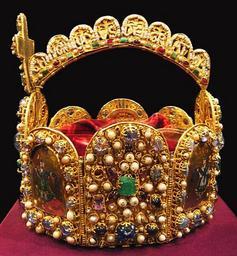 | Keywords: Weltliche Schatzkammer Wien (176)pano2.jpg Die Reichskrone Westdeutsch 2 H 10 Jahrhundert; das Kronenkreuz einer Hinzufügung des frühen 11 Jahrhunderts; der Bügel aus der Zeit Kaiser Konrads II 1024-1039 ; die rote Samthaube aus dem 18 Jahrhundert Gold Email Zellenschmelz Edelsteine Perlen Stirnplatte H 14 9 cm B 11 2 cm ; Kronenkreuz H 9 9 cm SK Inv -Nr XIII 1 The Imperial Crown Western Germany 2nd half of the 10th century The cross is an addition from the early 11th century; the arch dates from the reign of Emperor Conrad II ruled 1024-1039 ; the red velvet cap is from the 18th century Gold cloisonné enamel precious stones pearls Brow plate H 14 9 cm W 11 2 cm; cross H 9 9 cm SK Inv No XIII 1 Own 2007-10 MyName Gryffindor Own CSvBibra and Gryffindor 2007 and cleaned up 2009 Image Weltliche Schatzkammer Wien 176 pano jpg Imperial Crown of the Holy Roman Empire Secular and Ecclesiastical Treasury |