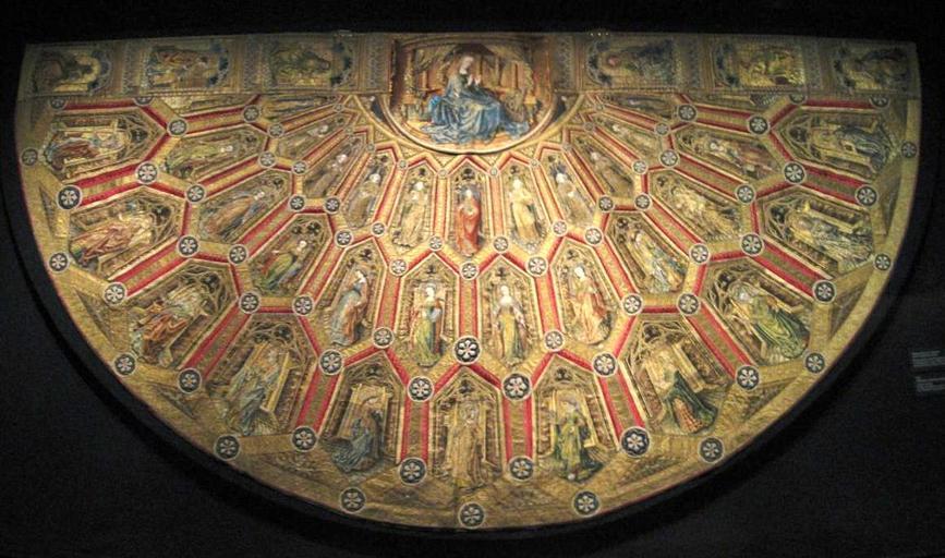 Keywords: Weltliche Schatzkammer Wien (239)pano.jpg Der Messornat des Ordens vom Goldenen Vlies Der Marienmantel im Pluvialschild die Fürbittende im ratialen Kapellenkranz Himmelschöre von Engeln heiligen Jungfrauen Frauen und Witwen Gold- und Silberfäden in Anlegetechnik Stickerei mit Seide Perlen B 330 cm 164 cm lang KK Inv -Nr 21 The Liturgical Vestments of the Order of the Golden Fleece The Cope of the Virgin Mary Hood the Virgin as intercessor; concentric rows of chapels heavenly choirs of angels holy virgins women and widows Gold and silver thread in appliqué technique embroidery with silk and pearls Creation Between 1433 and 1442 Robert Campin designed three embroidered copes commissioned by Philip the Good These copes were probably produced in the workshop of Thierry du Chastel an embroider who originally came from Paris The vestment worn at the prayer services of the order of the Golden Fleece may be regarded as an artistic response to the Ghent Altarpiece by the van Eyck brothers completed in 1432 Thürleman Felix Robert Campin A monographic study with a critical catalogue 2002 Prestel W 330 cm L 164 cm KK Inv No 21 Own 2007-10 MyName Gryffindor Embroidered copes commissioned by Philip the Good |