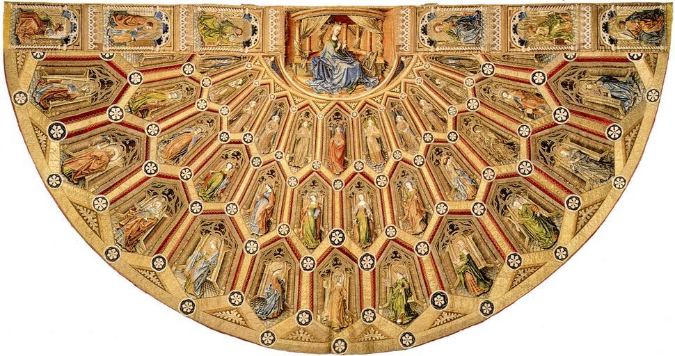 Keywords: Weltliche Schatzkammer Wien (239)pano-new.jpg Der Messornat des Ordens vom Goldenen Vlies Der Marienmantel im Pluvialschild die Fürbittende im ratialen Kapellenkranz Himmelschöre von Engeln heiligen Jungfrauen Frauen und Witwen Gold- und Silberfäden in Anlegetechnik Stickerei mit Seide Perlen B 330 cm 164 cm lang KK Inv -Nr 21 The Liturgical Vestments of the Order of the Golden Fleece The Cope of the Virgin Mary Hood the Virgin as intercessor; concentric rows of chapels heavenly choirs of angels holy virgins women and widows Gold and silver thread in appliqué technique embroidery with silk and pearls Creation Between 1433 and 1442 Robert Campin designed three embroidered copes commissioned by Philip the Good These copes were probably produced in the workshop of Thierry du Chastel an embroider who originally came from Paris The vestment worn at the prayer services of the order of the Golden Fleece may be regarded as an artistic response to the Ghent Altarpiece by the van Eyck brothers completed in 1432 Thürleman Felix Robert Campin A monographic study with a critical catalogue 2002 Prestel W 330 cm L 164 cm KK Inv No 21 http //www aiwaz net/panopticon/cope-of-mary/gi1891c163 www aiwaz net 2007-10 Creator Robert Campin PD-old-100 Embroidered copes commissioned by Philip the Good |