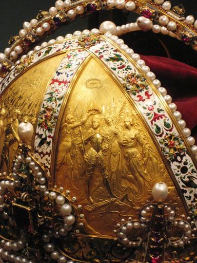 Keywords: Weltliche Schatzkammer Wien (258d).JPG Rudolf II als Sieger über die Türken Imperator Die Krone Kaiser Rudolfs II ; später Krone des Kaisertums Österreich Jan Vermeyen gest 1606 Prag Prag 1602 Gold teilweise emailliert Edelsteine Perlen Samt H 28 3 cm Kronreif 22 4 cm Durchmesser mit Perlen größte Spannweite über Stirn- und Nackenlilien 27 8 cm SK Inv -Nr XIa 1 Rudolf II as the victor over the Turks Imperator The Crown of Rudolf II later Crown of the Austrian Empire Jan Vermeyen Prague 1602 Gold partially enamelled diamonds rubies spinel rubies sapphire pearls velvet H 28 3 cm circlet 22 4 cm in diameter with pearls largest span over the fleurs-de-lis on the brow and neck 27 8 cm SK Inv No XIa 1 Own 2007-10 MyName Gryffindor Imperial Crown of Austria Secular and Ecclesiastical Treasury |