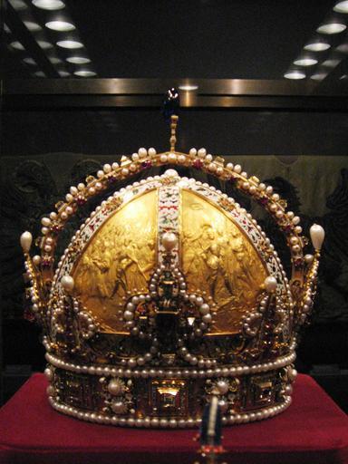 Keywords: Weltliche Schatzkammer Wien (268).JPG Die Krone Kaiser Rudolfs II ; später Krone des Kaisertums Österreich Jan Vermeyen gest 1606 Prag Prag 1602 Gold teilweise emailliert Edelsteine Perlen Samt H 28 3 cm Kronreif 22 4 cm Durchmesser mit Perlen größte Spannweite über Stirn- und Nackenlilien 27 8 cm SK Inv -Nr XIa 1 The Crown of Rudolf II later Crown of the Austrian Empire Jan Vermeyen Prague 1602 Gold partially enamelled diamonds rubies spinel rubies sapphire pearls velvet H 28 3 cm circlet 22 4 cm in diameter with pearls largest span over the fleurs-de-lis on the brow and neck 27 8 cm SK Inv No XIa 1 Own 2007-10 MyName Gryffindor Imperial Crown of Austria Secular and Ecclesiastical Treasury |